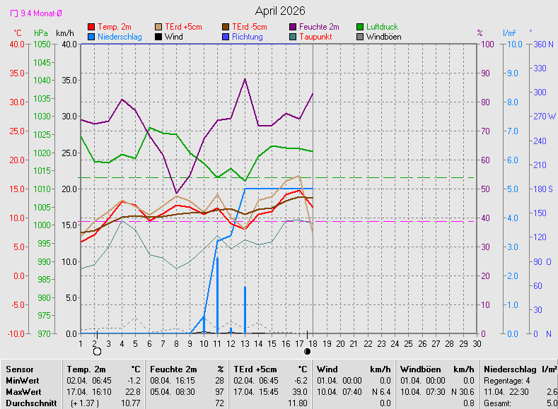 | Maximum | 1029,1hPa | 06.04.2026 | Maximum | 6,4km/h N (2Bft) | 10.04.2026 | ||
