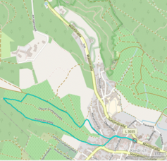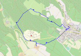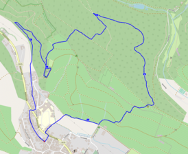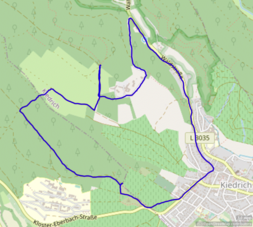 Ab dem "Kiedricher Hof" folgen wir dem Wanderweg 6, der hier auch gleichzeitig auf dem Rheinsteig entlang führt. An der Stelle, an der die "6" wieder in Richtung Kiedrich abbiegt, geht es noch ein paar Meter weiter den Rheinsteig entlang (bzw. den Wegen 7 und 8). An der nächsten großen Kreuzung geht es dann hinauf in Richtung Lauftreff. Auf halber Höhe gibt es einen kurzen Abstecher zum Hahnwaldgelände, von wo aus sich ein weitläufiger Blick über den Rhein bietet. Derzeit (2021) erfolgen hier die Abrissarbeiten der in die Jahre gekommenen Gebäude. Es soll eine neue Appartementanlage entstehen. Wir gehen jetzt wieder zurück zum Weg in Richtung Lauftreff. Nach ein paar Schritten geht es links auf einem Wiesenweg entlang Richtung Wald. Am Ende des Waldweges geht es dann rechts entlang weiter in Richtung Hauptweg. Dem großen Waldweg (8) folgen wir nach links. Nach ca. 500m gibt es die nächste große Kreuzung. Hier biegen wir links und dann gleich wieder rechts auf den Weg 9. Vorbei an der "Valentin-Statzner-Hütte" und der "Förster Müller Eiche". Nach weiteren ca. 500m verlassen wir wieder die "9" und biegen ab auf die "4" - allerdings entgegen der ausgewiesenen Richtung. Kurz darauf bietet sich wieder ein wunderschöner Blick in die Ferne. Am Hedwig-Witte-Blick kann man eine kleine Rast einlegen. Im Sommer ist hier allerdings die Vegetation zu dicht, sodass man von da aus nicht mehr viel vom ehemaligen Fernblick genießen kann. Hinter dem Rastplatz geht es dann einen schmalen Weg bergauf zum nächsten größeren Weg. Dem wird dann weiter gefolgt, bis der "Kahle Born" erreicht ist - eine beliebte Quelle frischen, kalkarmen Wassers. Ab hier geht es dann in Richtung Parkplatz Butterhütte. Entlang der Straße geht es jetzt ein paar Meter hinauf um dann die Straße zu überqueren. Auf dem Waldweg nach der Straße wählen wir den rechten Weg bergab. Kurz danach erreichen wir den Weg 4a. Diesem Weg folgen wir jetzt ein paar Kilometer, vorbei am Walkenbach-Blick, ehe es kurz vor dem elften Kilometer nach links bergauf geht in Richtung "Hauptweg". Dieser Hauptweg ist der Wanderweg 3 bzw. 4 - wieder entgegengesetzt der offiziellen Richtung. Am Waldende geht es dann rechts hinab über einen schmalen Trampelpfad in Richtung Burg Scharfenstein, von der aus sich noch ein letzter Blick über Kiedrich und die Weinberge bietet. Anschließend geht es eine steile, wilde Treppenanlage hinunter. Kurz darauf geht es links entlang des Kiedrich-Baches zum Tränkweg. Diesem folgen wir dann hinauf zur Suttonstraße, von der aus der Startpunkt der Wanderung über verschiedene Varianten leicht zu erreichen ist.